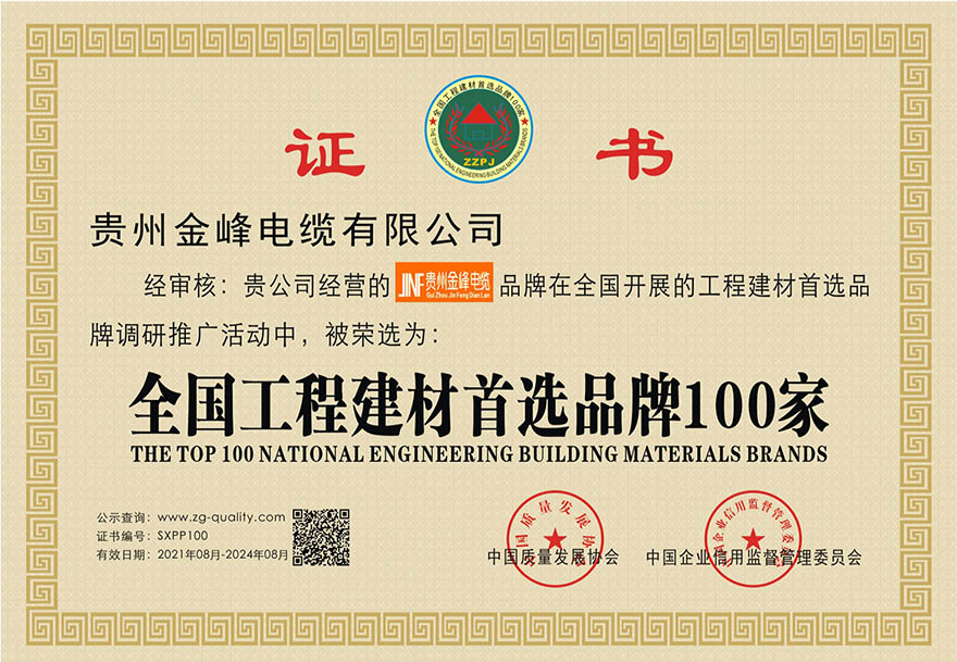 全國(guó)工程建材首先選品牌100家證書(shū)